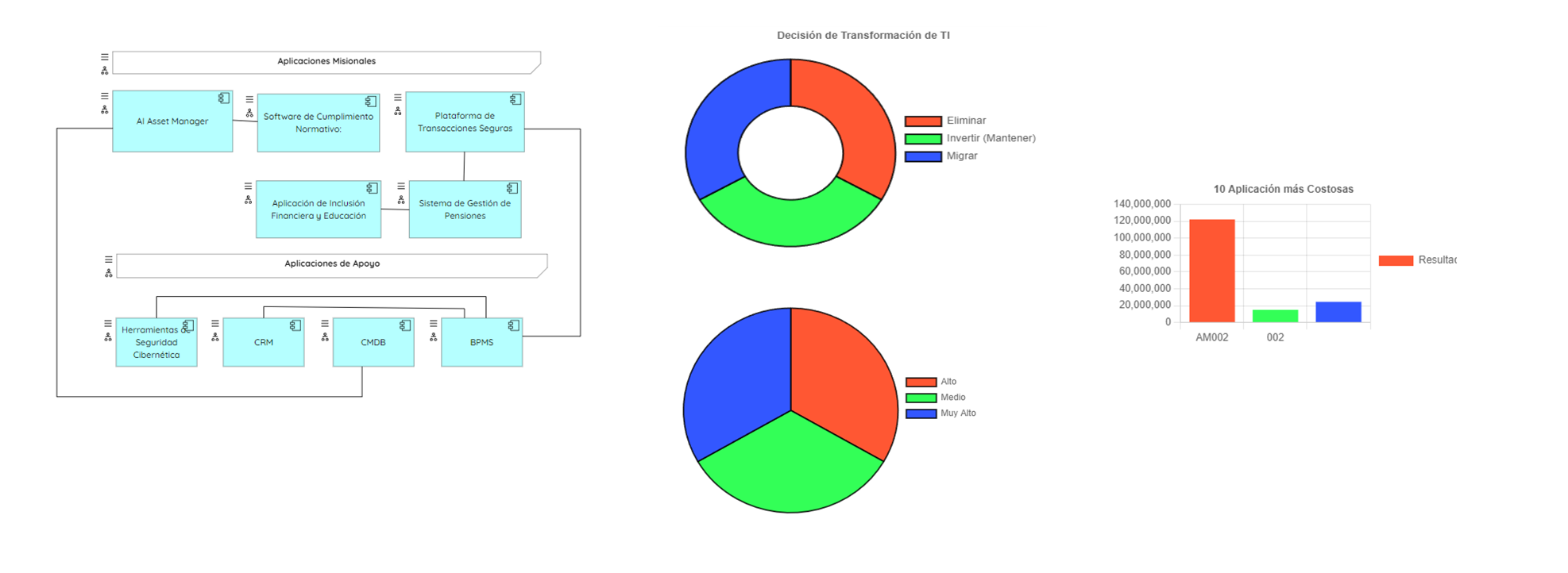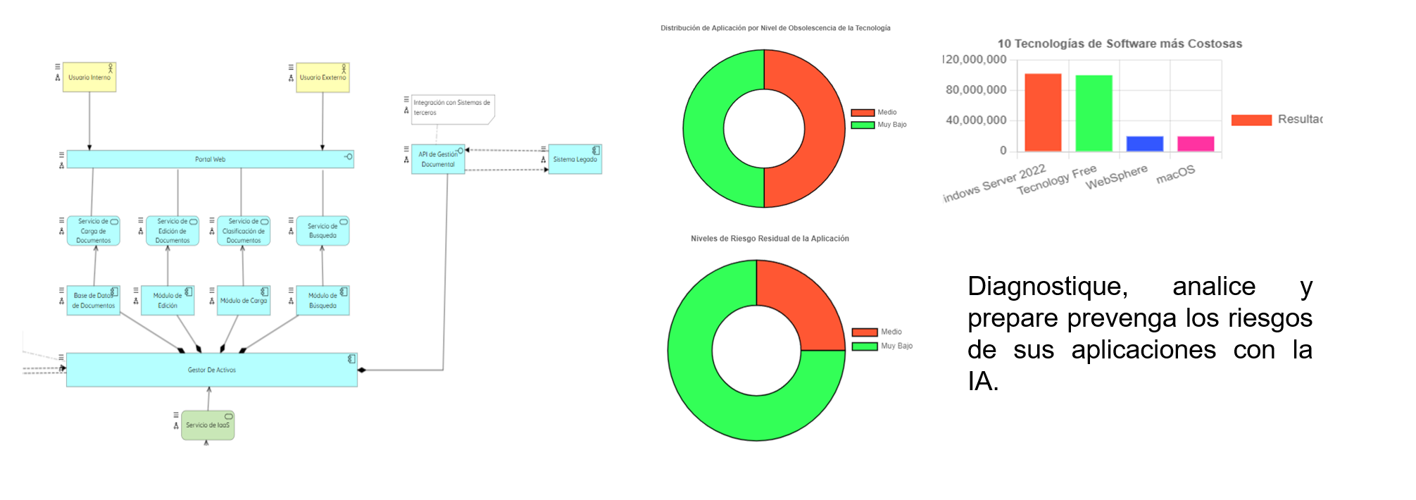 Permite modelar la arquitectura de software bajo notación estándar Archimate, permite evaluar las aplicaciones, monitorear el estado de los servicios, analizar sus costos, su criticidad hacia el negocio y sus riesgos.