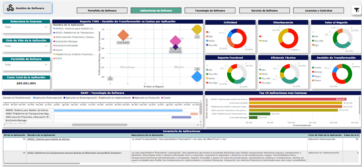 Este módulo proporciona gestionar la salud de las Soluciones de Software de la organización, usando (APM) como buena práctica de industria, esto permite tomar decisiones de transformación de TI alineadas con el negocio.