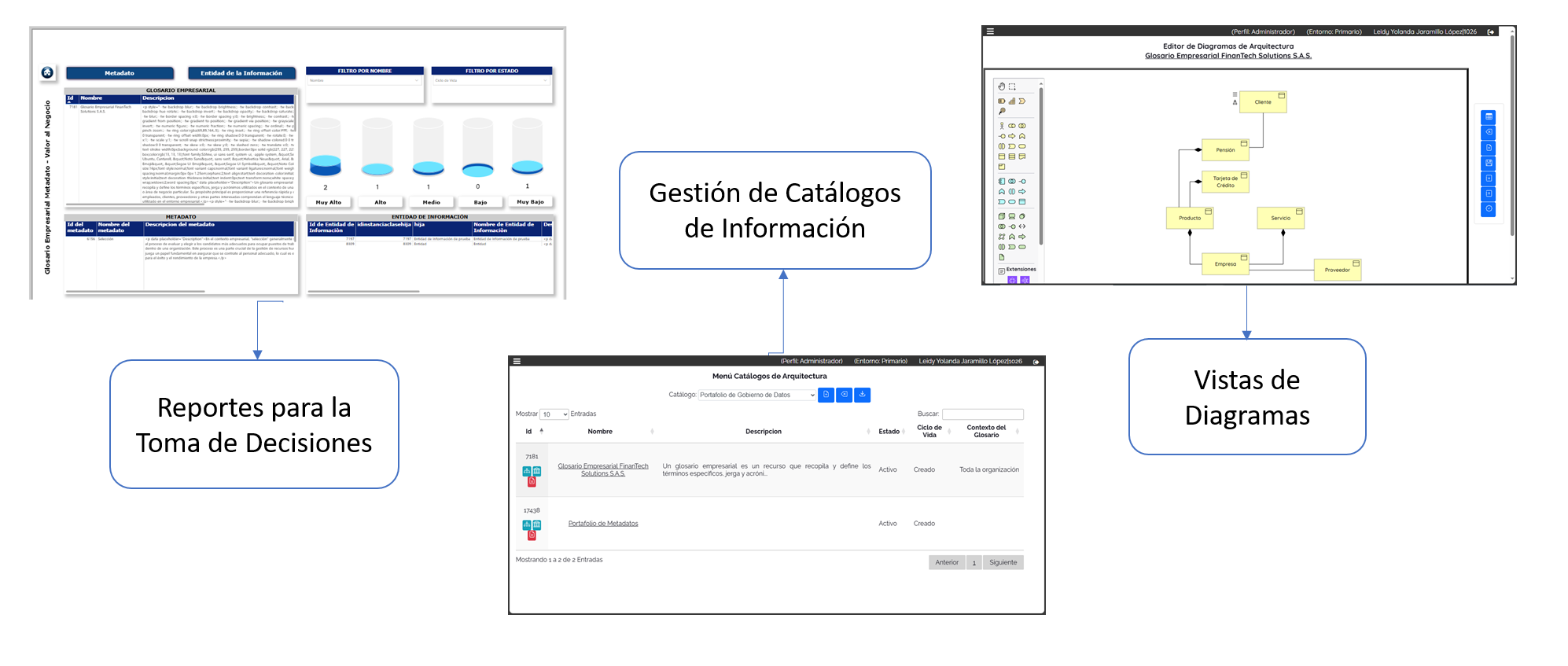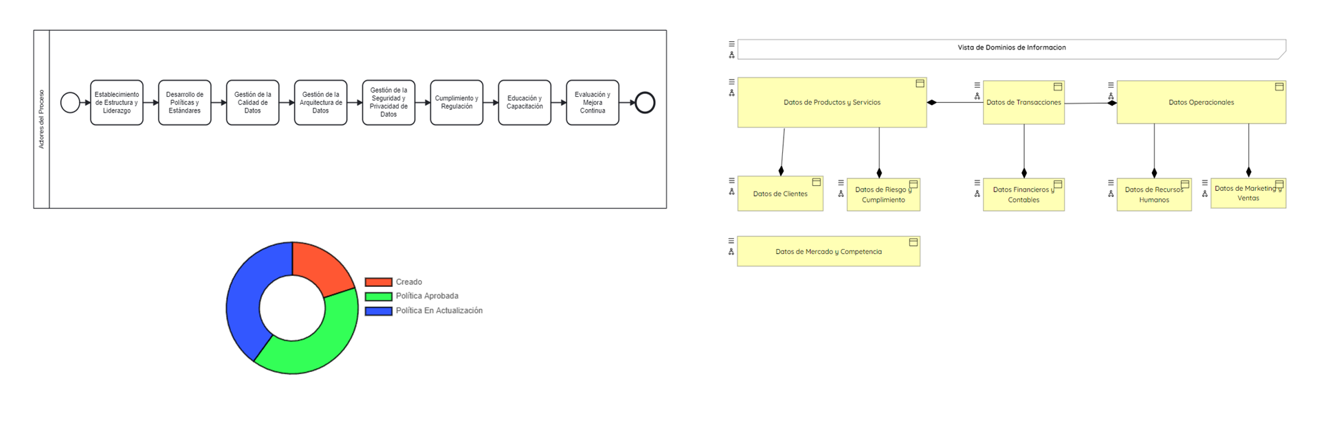 Permite Gestionar el Gobierno de Datos, a través de políticas, procesos, la adopción de buenas prácticas de industria como DAMA, el desarrollo de la Arquitectura de datos en sus capas Conceptual y Lógica, el monitoreo a la calidad de los datos de la entidad y la mejora continua.
