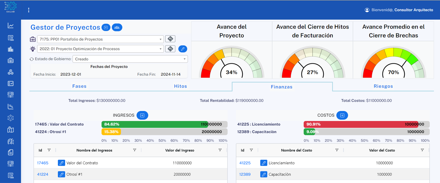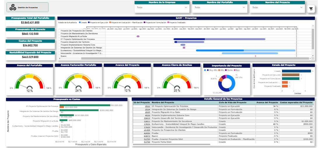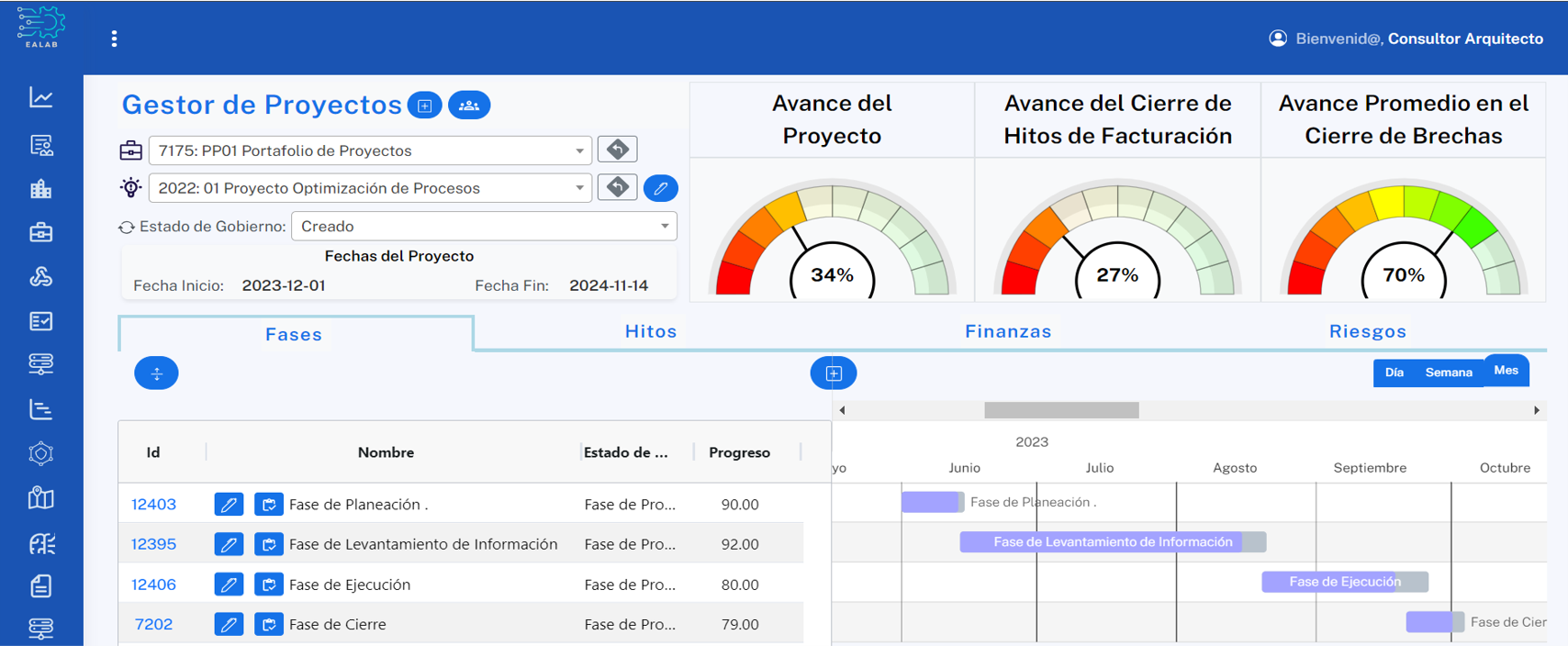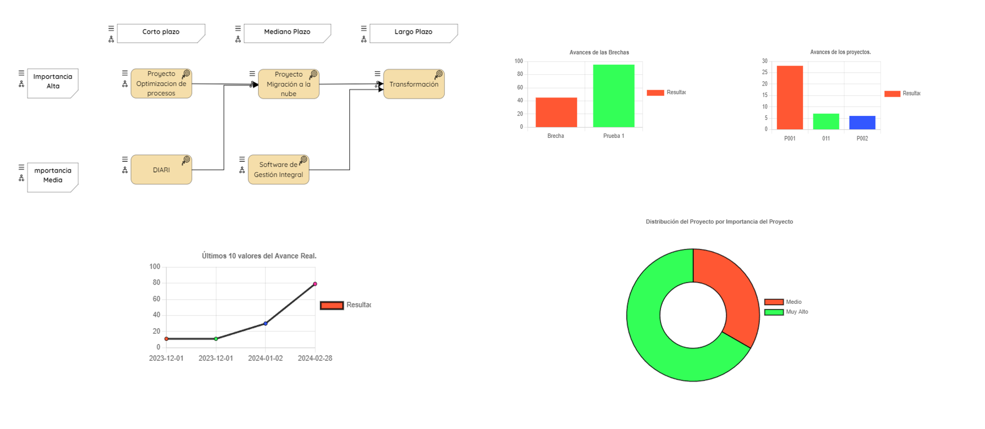 Esto facilita la priorización y asignación óptima de recursos, mejorando la eficiencia y reduciendo costos. Además, ofrece herramientas para la monitorización del progreso, identificando posibles desviaciones y permitiendo la implementación de medidas correctivas de manera oportuna. La integración con otros módulos, como la gestión de TI y datos, mejora la coordinación y comunicación entre equipos, asegurando la coherencia y sinergia entre diferentes iniciativas.