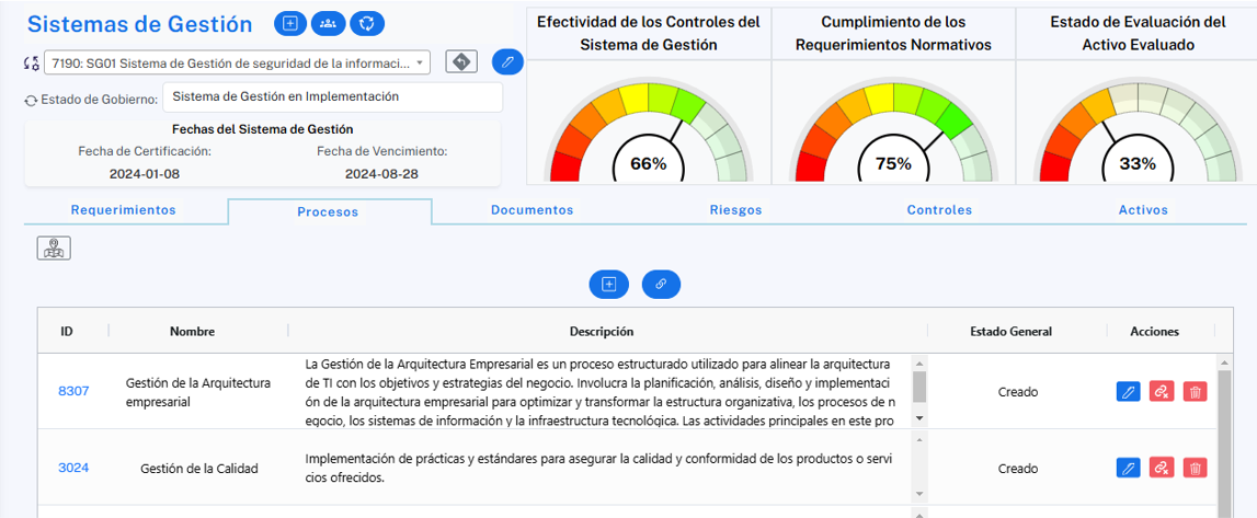 El módulo para GRC ofrece herramientas para la adopción de normativas como ISO9001, ISO27001, o Sistema de Gestión de Riesgo Operativo (SARO), Sistema de Gestión de Seguridad de la Información (SGSI), Sistema de Gestión de Continuidad del Negocio (SGCN) entre otros, proporciona mecanismos de gestión para Riesgos, Controles, Incidentes (Eventos de Riesgo), Activos, Requerimientos Normativos, garantizando la resiliencia y preparación ante posibles contingencias.
